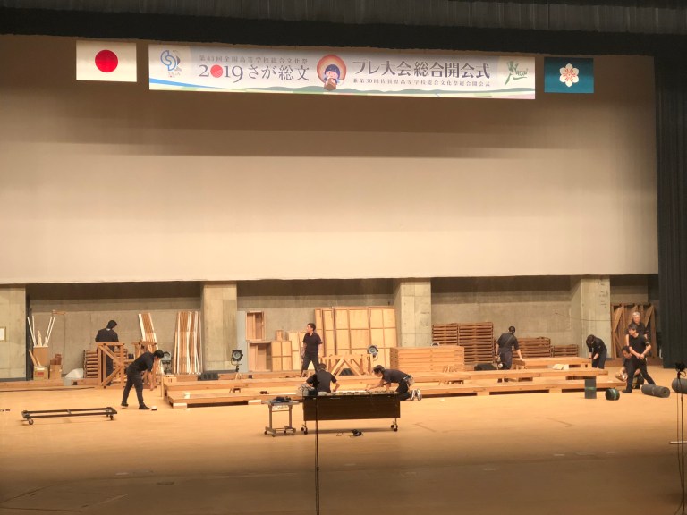 舞台上では開会式などでも使われる合唱台、ひな壇を組み立てる。