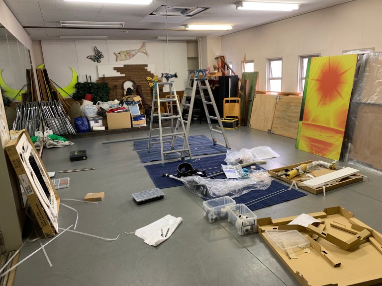 スタジオでは早朝から、壊れたエアコンを取り替える工事が夕方まであっていて、事務室も片方のスタジオも廊下も使えない状態が続き、広い残ったスタジオでポツリと仕事をしていました。