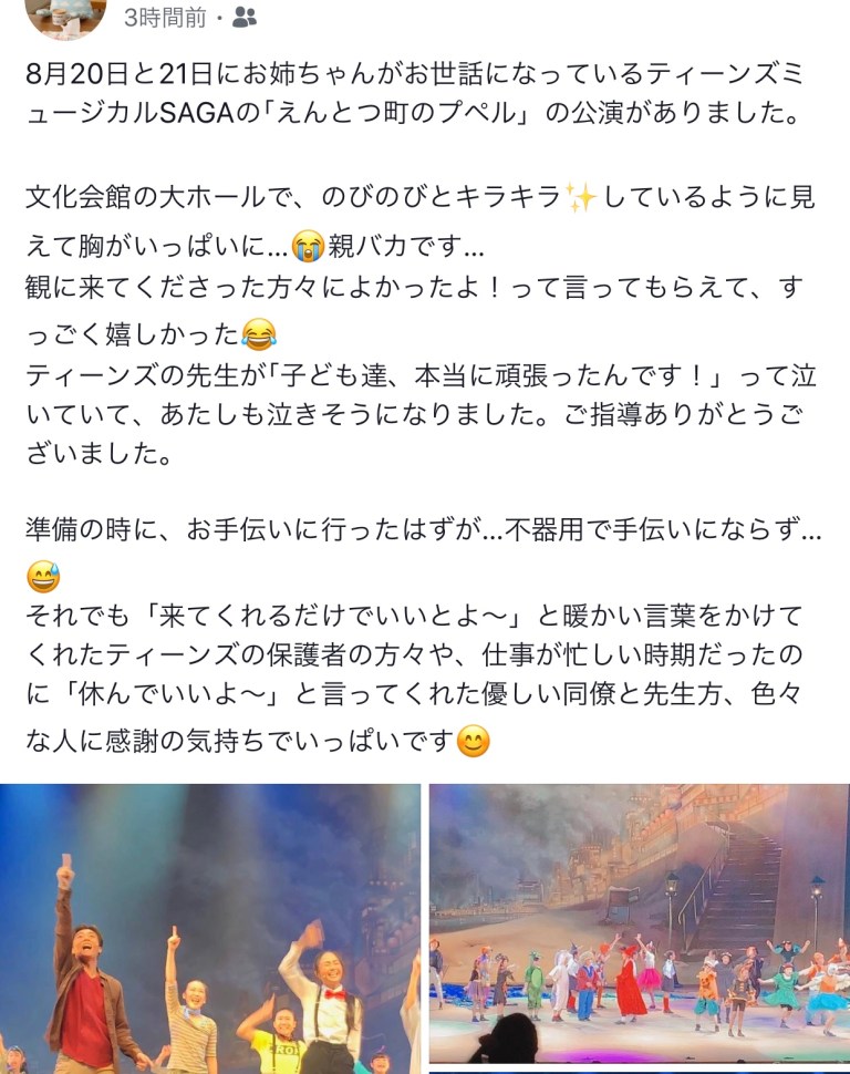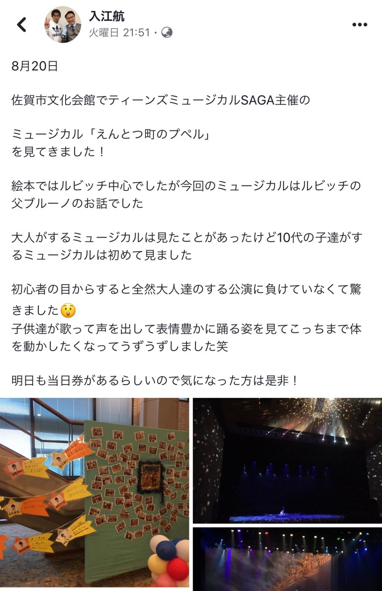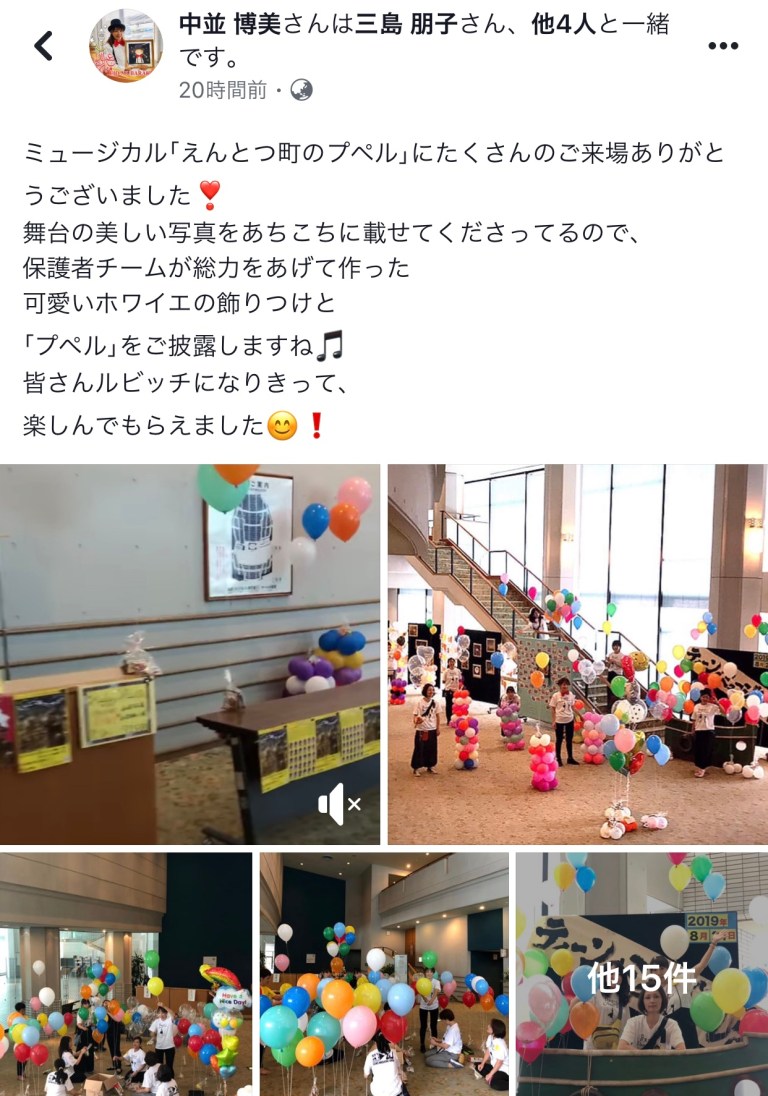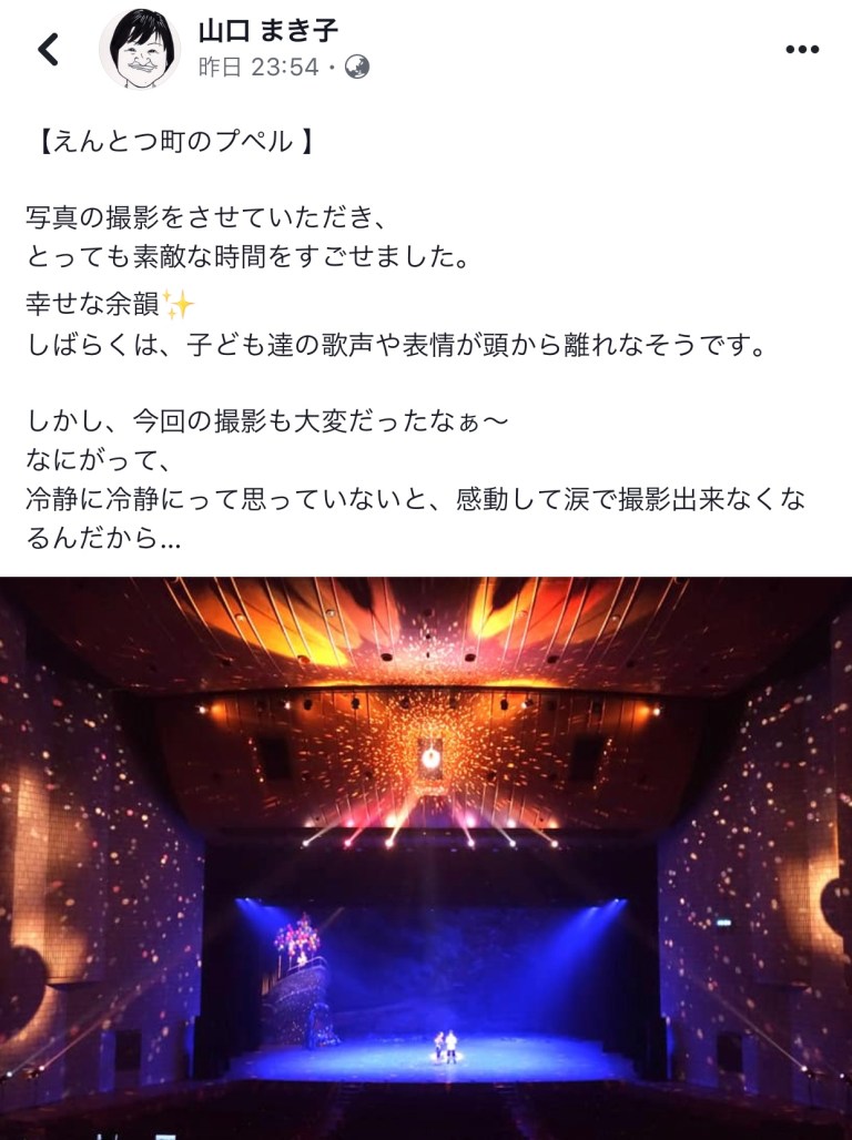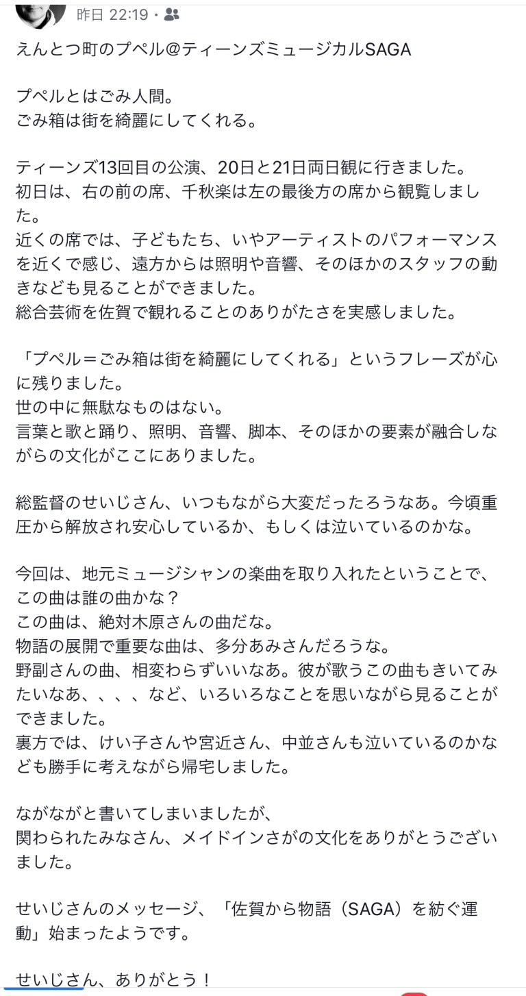 2019年8月23日2019年8月23日千秋楽の感想、いっぱい❣️ Scroll down to content 前回に引き続き、二日目、千秋楽を見て下さった人たちからの感想を拾い上げてみました。 皆さん‼️ありがとうございました❣️ 共有: クリックして X で共有 (新しいウィンドウで開きます) X Facebook で共有するにはクリックしてください (新しいウィンドウで開きます) Facebook いいね 読み込み中… 投稿者: 風のたね★せ〜じ トータル アート コーディネーター#イベント、ステージ、映像、@演出、プロデュース、脚本、作曲、振付、@音響、照明、衣装、メイク、デザイン、@印刷、会場、タレント、MC、手配、ケータリング、@教育、指導、講演 風のたね★せ〜じ の投稿をすべて表示