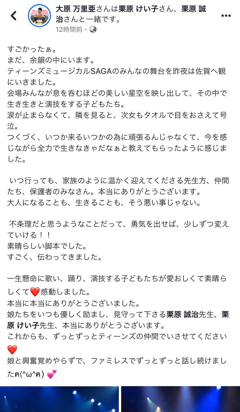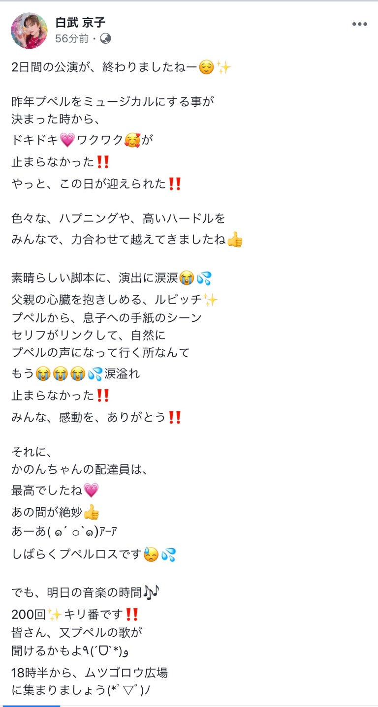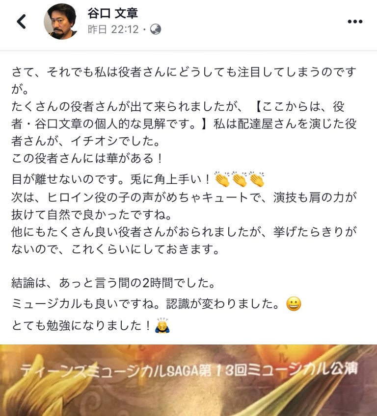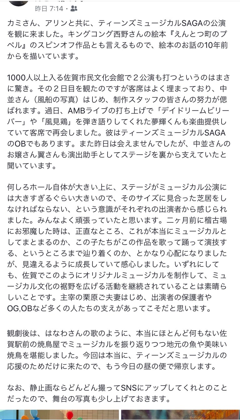 2019年8月23日2019年8月23日千秋楽の感想、いっぱい❣️ Scroll down to content 前回に引き続き、二日目、千秋楽を見て下さった人たちからの感想を拾い上げてみました。 皆さん‼️ありがとうございました❣️ 共有: クリックして X で共有 (新しいウィンドウで開きます) X Facebook で共有するにはクリックしてください (新しいウィンドウで開きます) Facebook いいね 読み込み中… 投稿者: 風のたね★せ〜じ トータル アート コーディネーター#イベント、ステージ、映像、@演出、プロデュース、脚本、作曲、振付、@音響、照明、衣装、メイク、デザイン、@印刷、会場、タレント、MC、手配、ケータリング、@教育、指導、講演 風のたね★せ〜じ の投稿をすべて表示