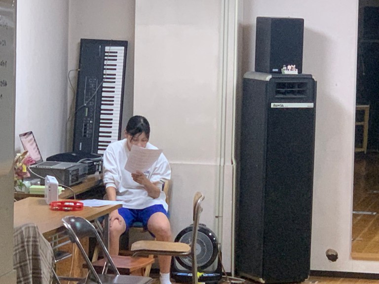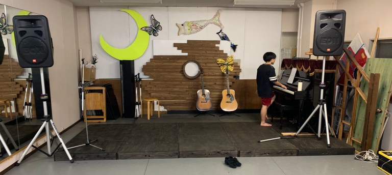 となりの部屋では子どもたちが自主練をしていて、ボクは手伝ってもらってライブハウスにしたいなぁと思って、舞台のスペースを作ったりしていた。出来るだけアンプラグドの演奏で、ステージができたらいいなぁと思っています。